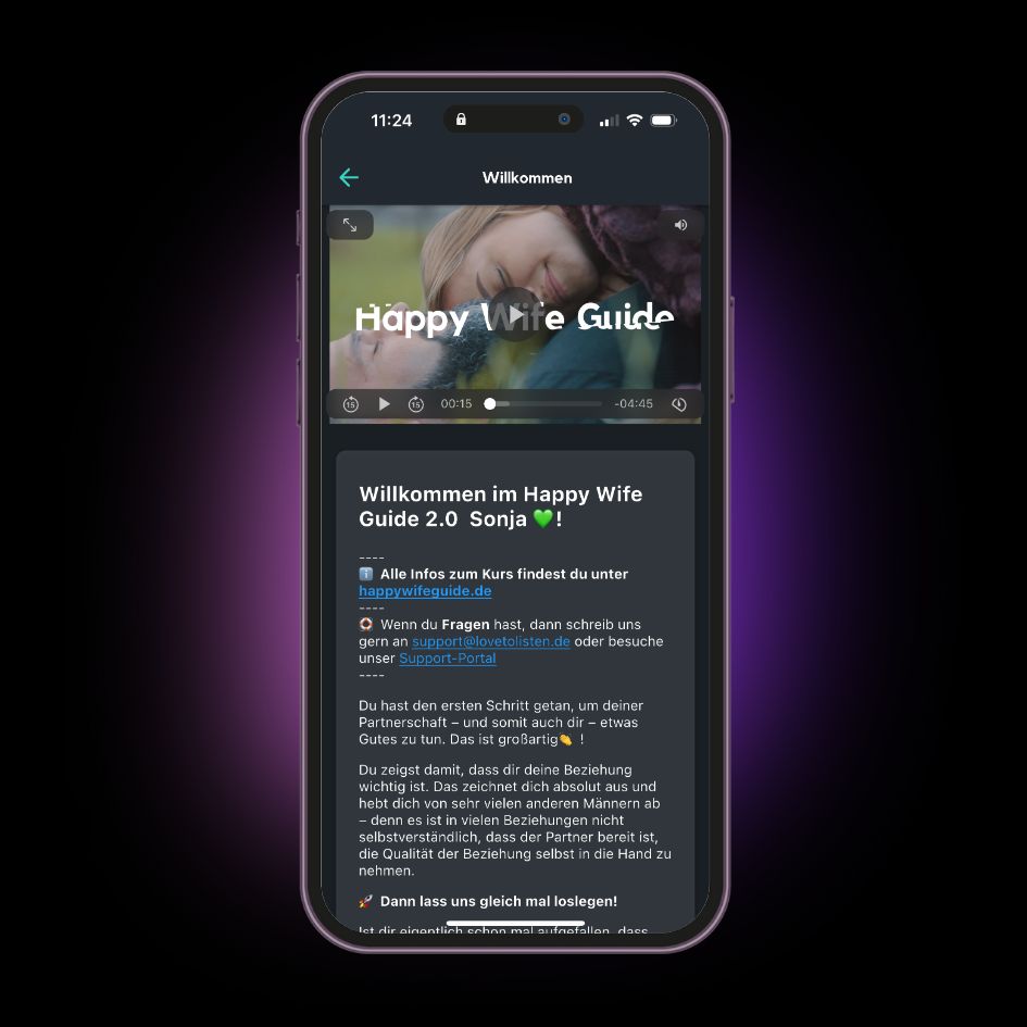 Du bekommst unbegrenzten Zugang auf die Kursinhalte und Zusatzfunktionen in unserer eigenen love to listen. App! So hast du deinen Happy Wife Guide immer dabei und kannst ungestört Zuhause, im Büro oder unterwegs auf die Video- und Audio-Inhalte zugreifen.